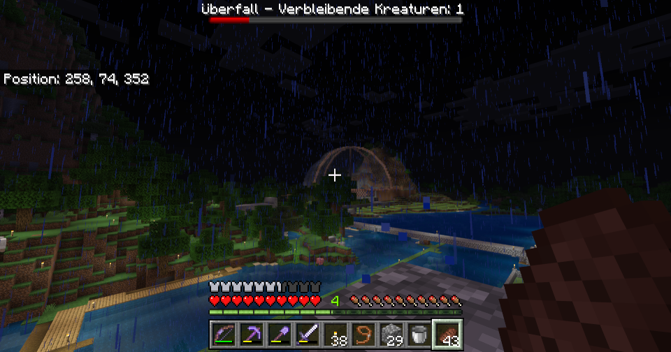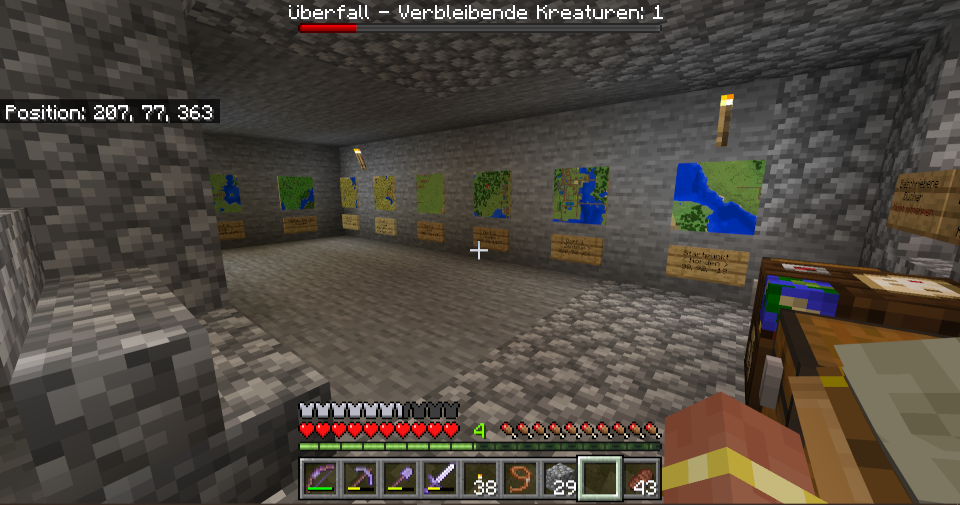 Verschiedene Spieler haben verschiedene Häuser gebaut. Die „Burg“ hat der Admin erstellt und enthält Kisten mit Material und Gegenständen. Es gibt ein paar NSC , mit denen man sprechen kann.