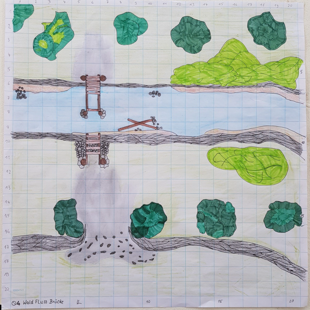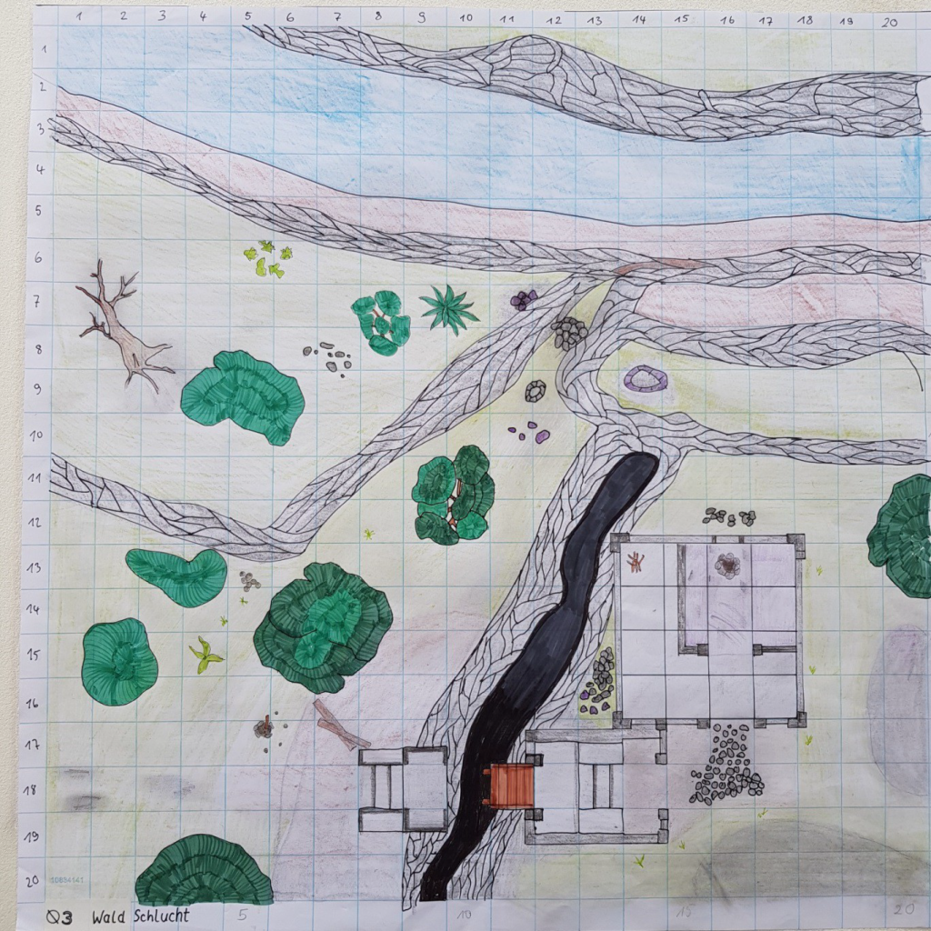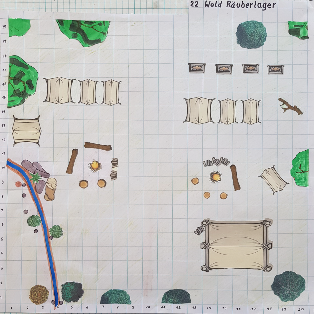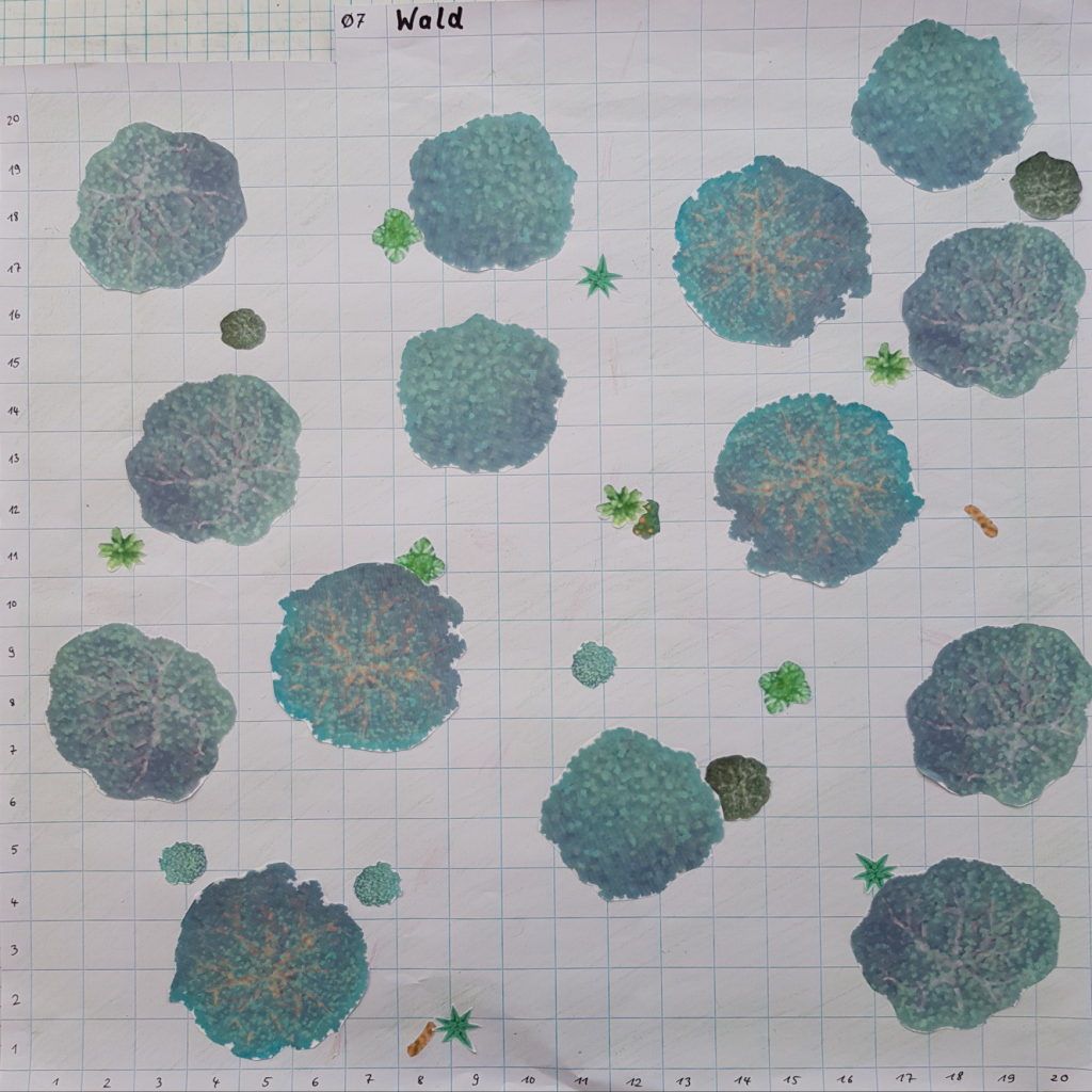 Diese Map wurde in Maps von 20×20 Raster a 25mm zerlegt. Dieses Format passt noch auf einen Tisch und lässt Platz für die Charakterbögen der Spieler.