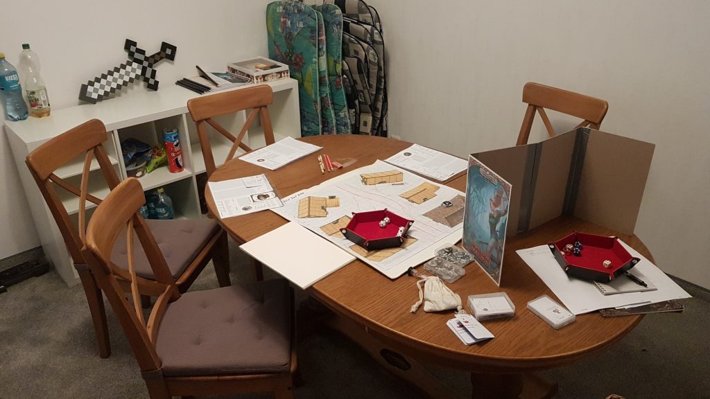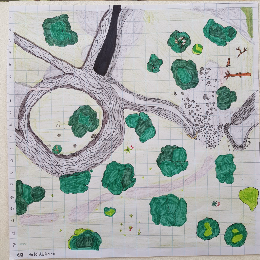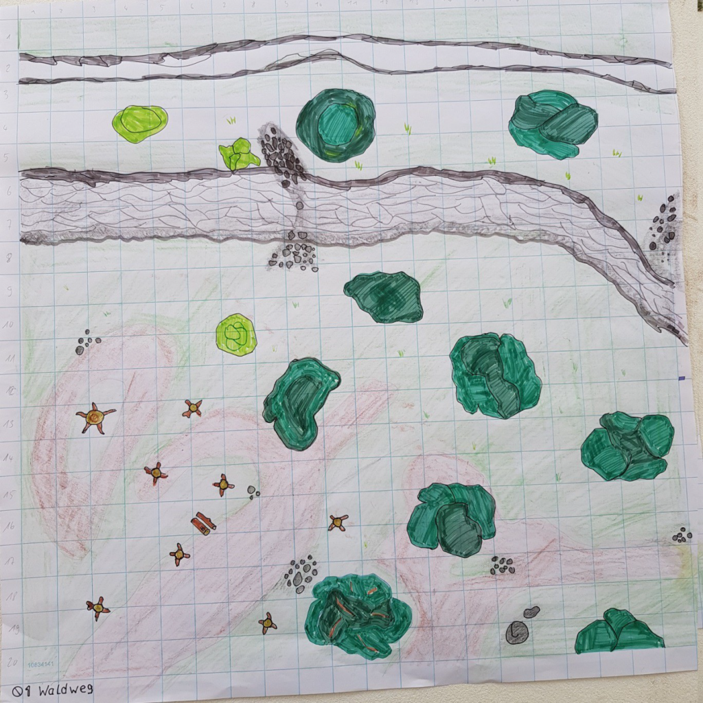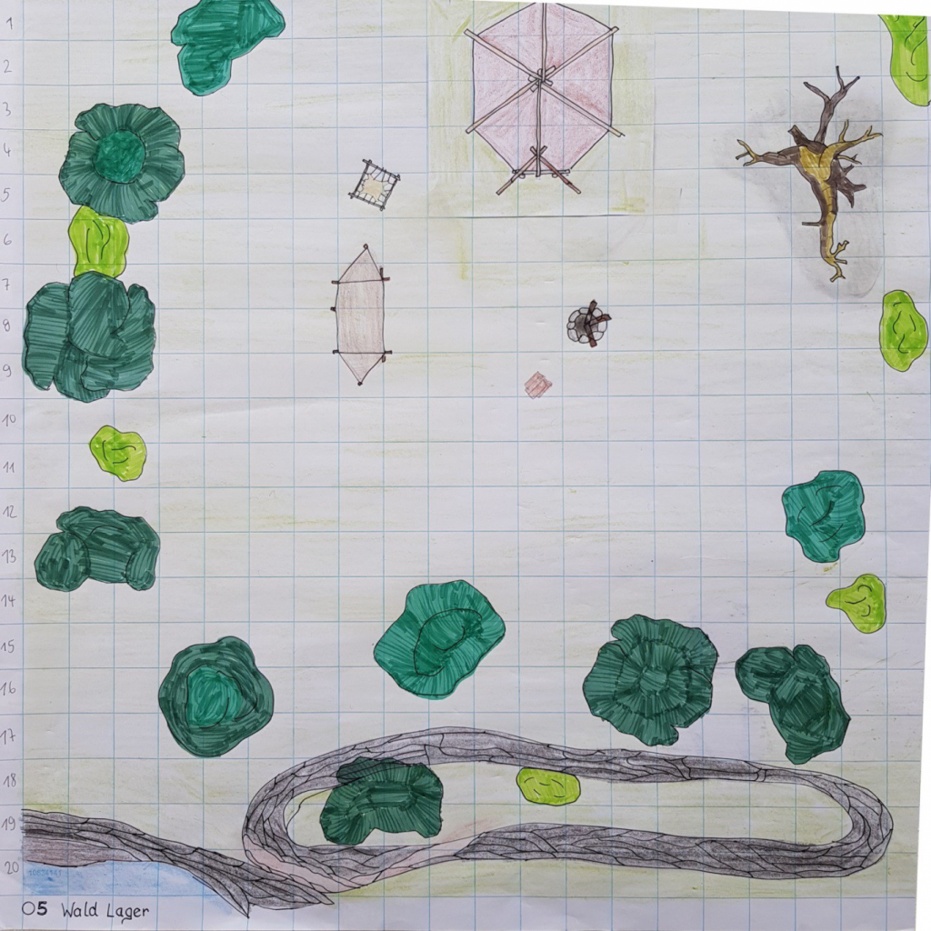 Diese Map wurde in Maps von 20×20 Raster a 25mm zerlegt. Dieses Format passt noch auf einen Tisch und lässt Platz für die Charakterbögen der Spieler.