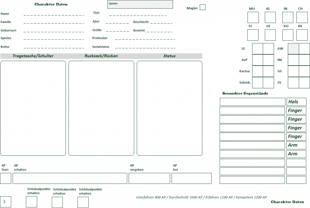 Nun bei Eigenschaften (Attribute), Talenten (Fertigkeiten), Kampfwerte und Geld kann man nicht viel machen außer aufschreiben, erweitern und ablesen.