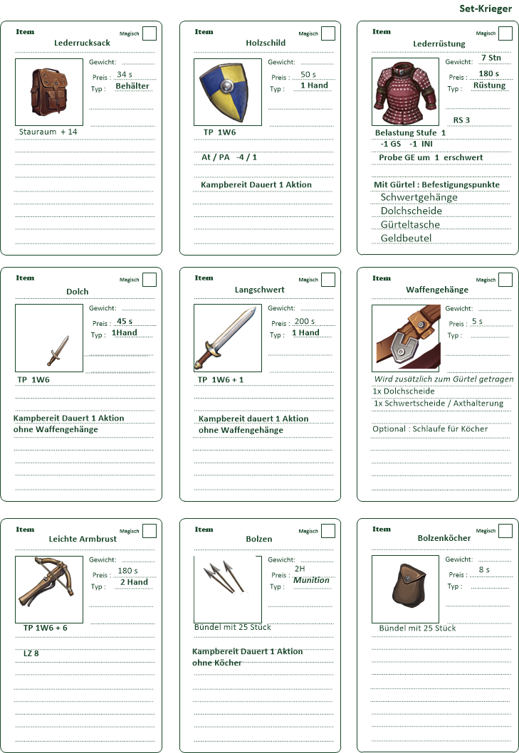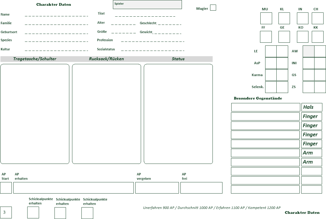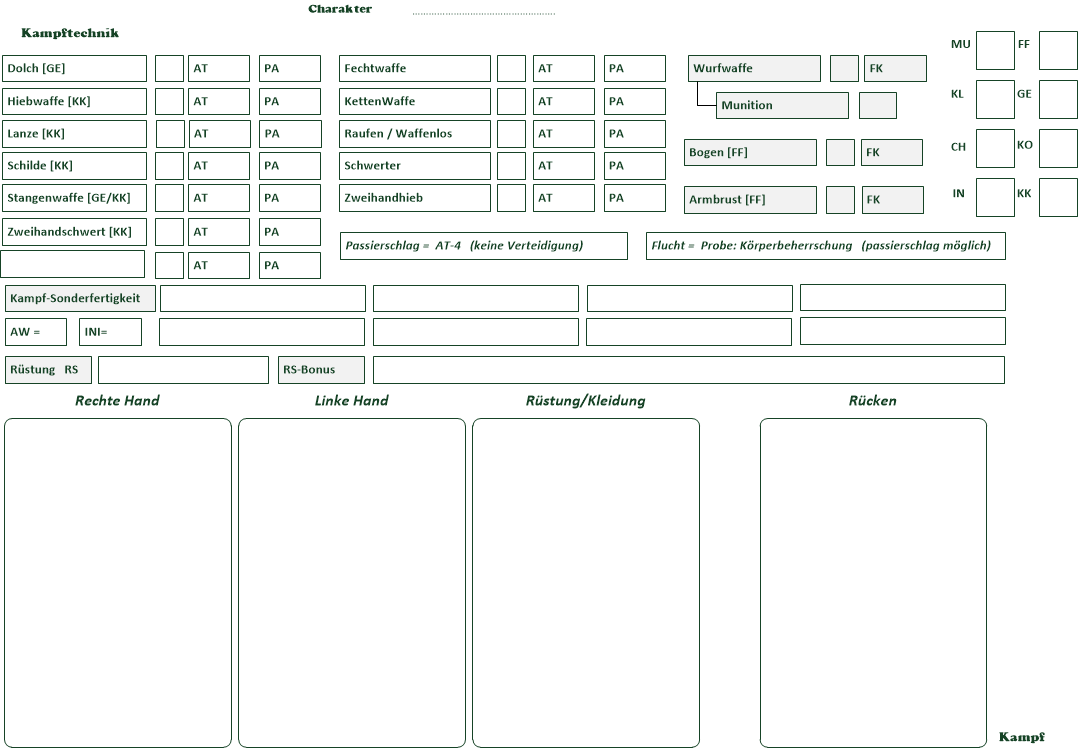 Nun bei Eigenschaften (Attribute), Talenten (Fertigkeiten), Kampfwerte und Geld kann man nicht viel machen außer aufschreiben, erweitern und ablesen.